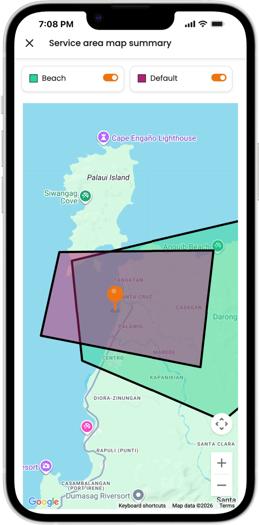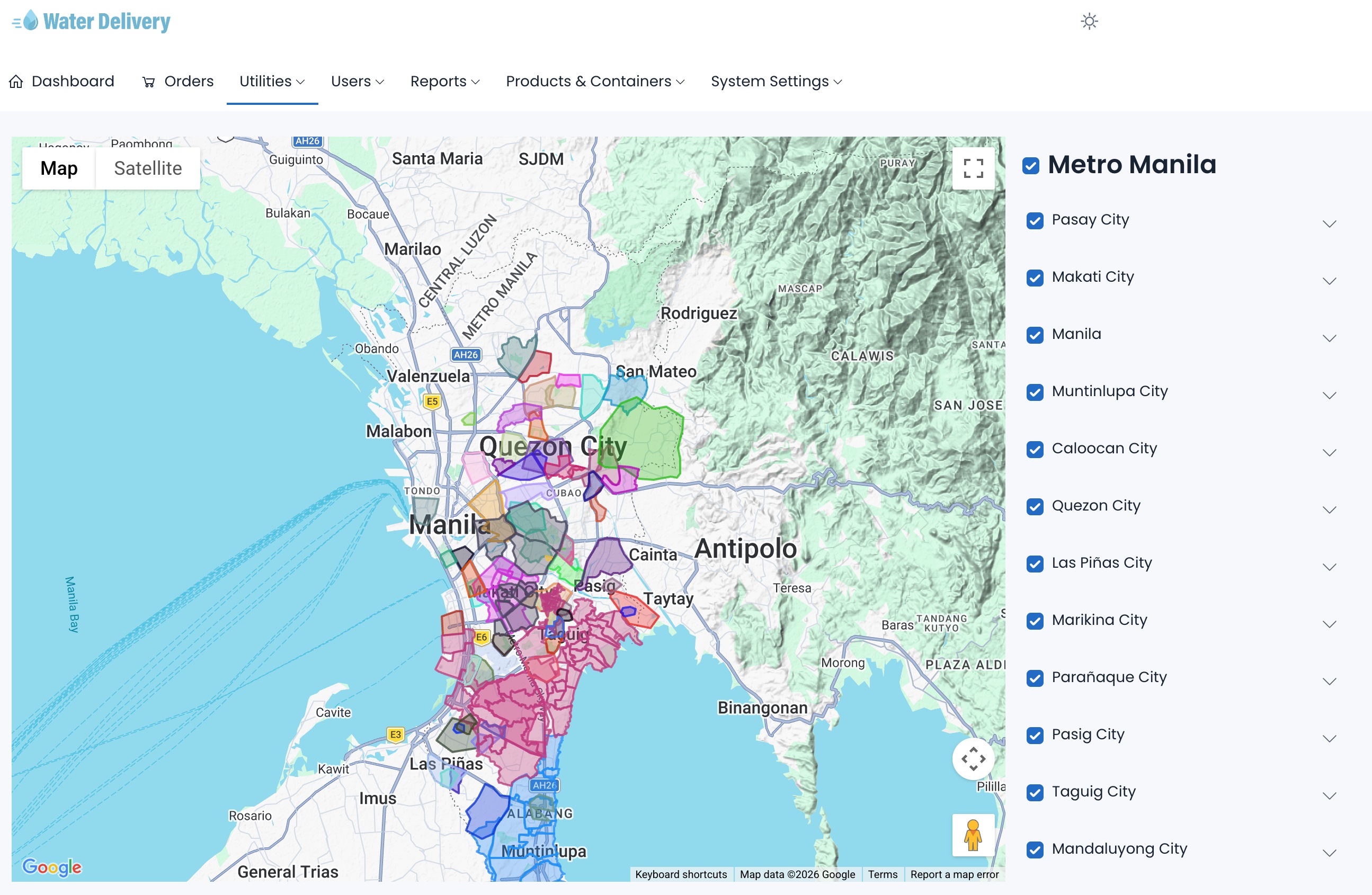 Corporate clients, companies and embassies tied to a preferred supplier, with billing consolidated to the company rather than per employee. Billing and invoicing covers supplier statements, sales invoices, service fees, and potability reports with downloadable PDFs per entry. The service area map plots delivery zones as polygons across Metro Manila so coverage gaps are visible at a glance. Analytics runs in two modes, quick summary or advanced chart breakdowns covering acquisition, retention, CLV, orders by channel, supplier growth, and delivery performance.